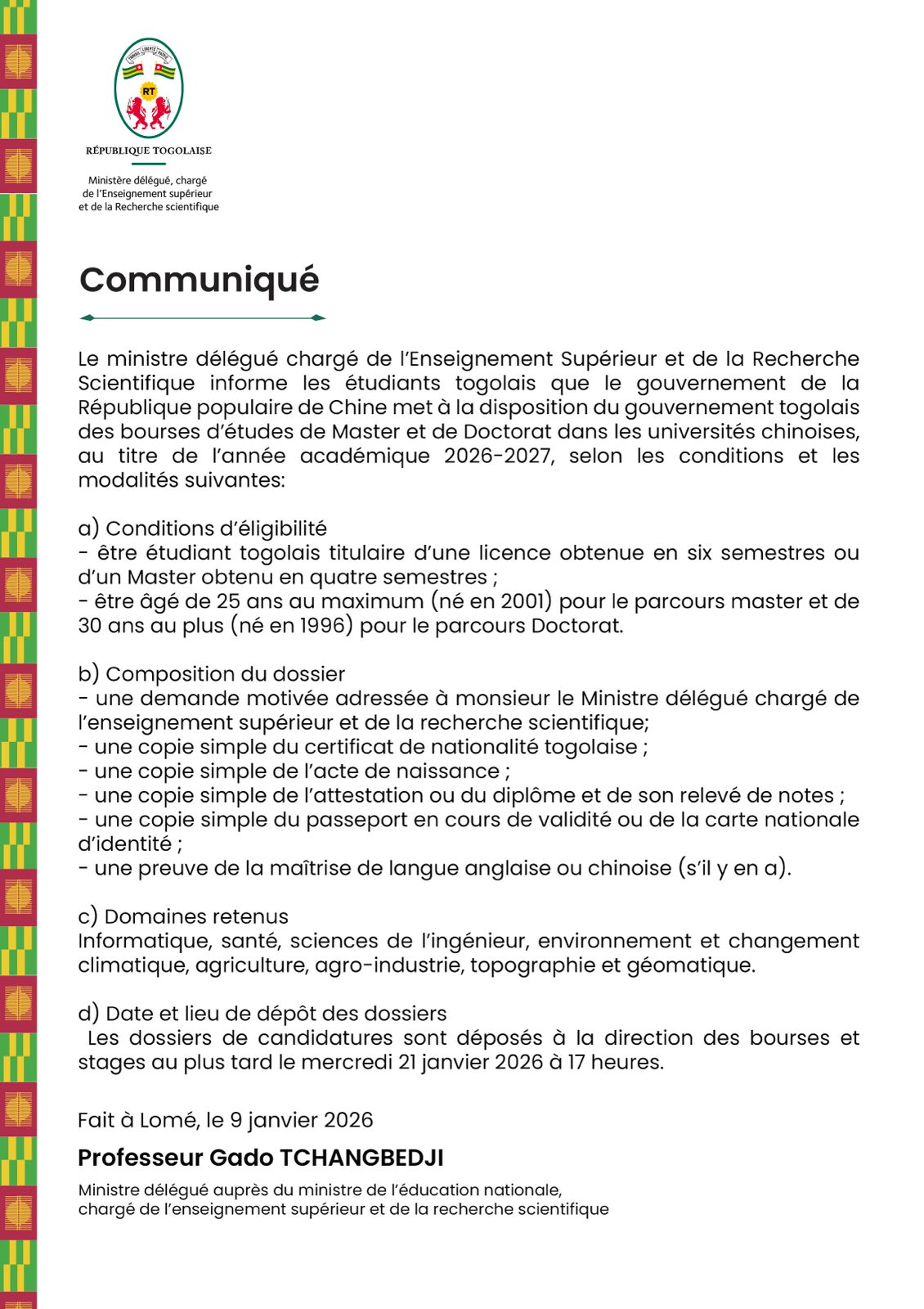 📢 Appel à candidatures pour des bourses d’études en Chine 2026-2027