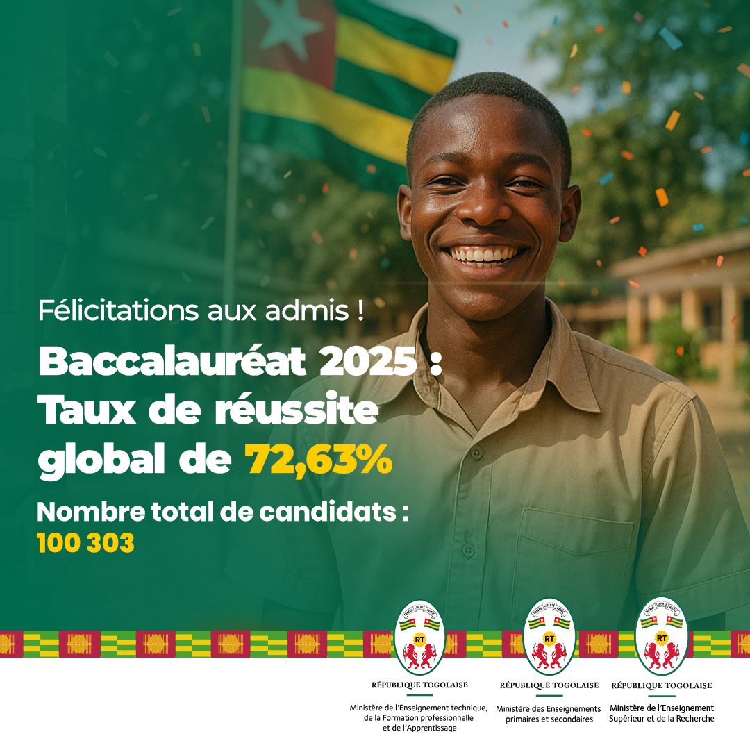 Les résultats de la session de juin 2025 du baccalauréat deuxième partie (BAC II) au Togo témoignent d’une progression remarquable. Le taux de réussite s’élève cette année à 72,63 %, contre 46,71 % en 2024. Cette augmentation illustre les efforts conjoints du gouvernement et de la communauté éducative (les élèves, les enseignants et les parents).