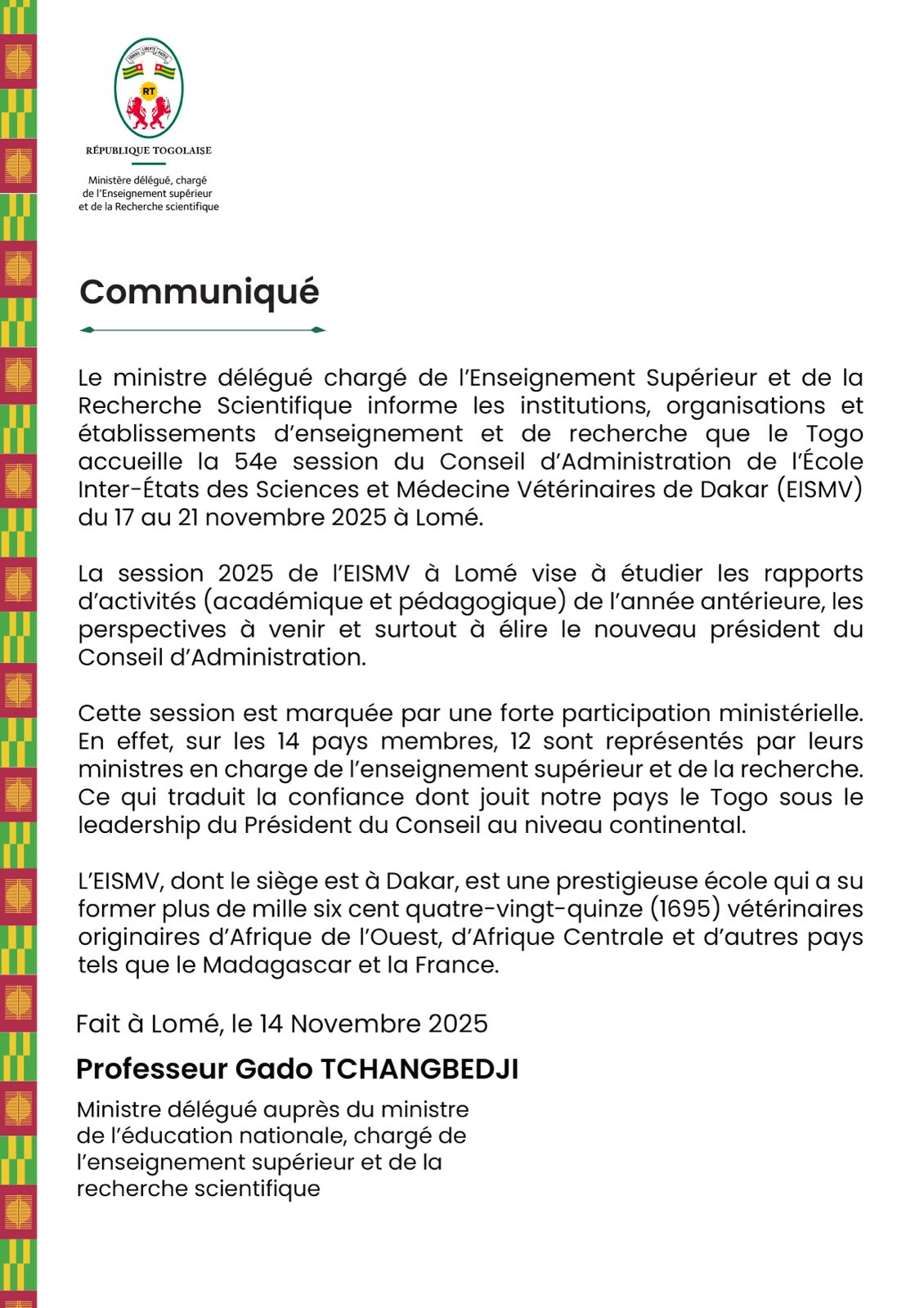 Le Togo accueille la 54ᵉ session du Conseil d’Administration de l’EISMV à Lomé