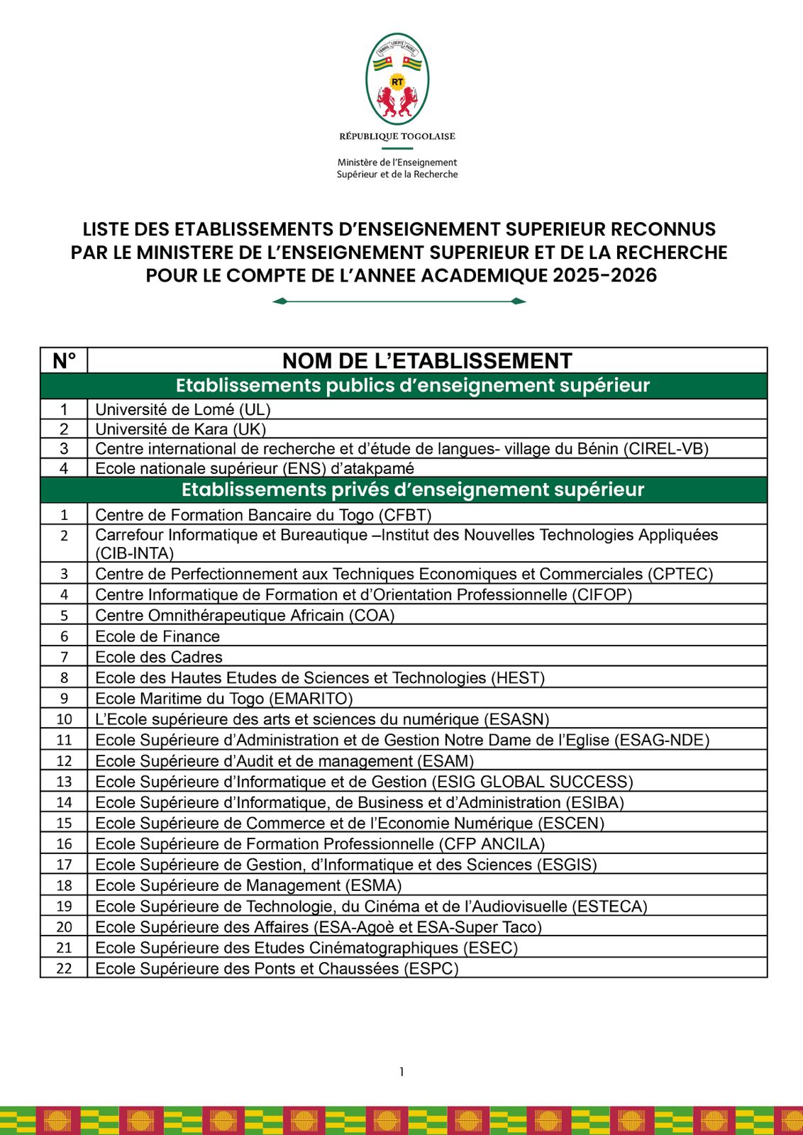 LISTE DES ETABLISSEMENTS D’ENSEIGNEMENT SUPERIEUR RECONNUS PAR LE MINISTERE DE L’ENSEIGNEMENT SUPERIEUR ET DE LA RECHERCHE POUR LE COMPTE DE L’ANNEE ACADEMIQUE 2025-2026